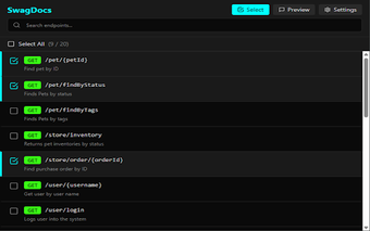 Med SwagDocs kan användare enkelt navigera till vilken Swagger UI-sida som helst och välja de endpointar de behöver med hjälp av inbyggda kryssrutor. Tillägget erbjuder också möjligheten att ladda ner dokumentationen som en .md-fil, vilket gör det enkelt att integrera i befintliga arbetsflöden för teknisk dokumentation. Den förbättrade detektionen och robusta layouten säkerställer att dokumentationen passar in i det övergripande utseendet på värdwebbplatsen.